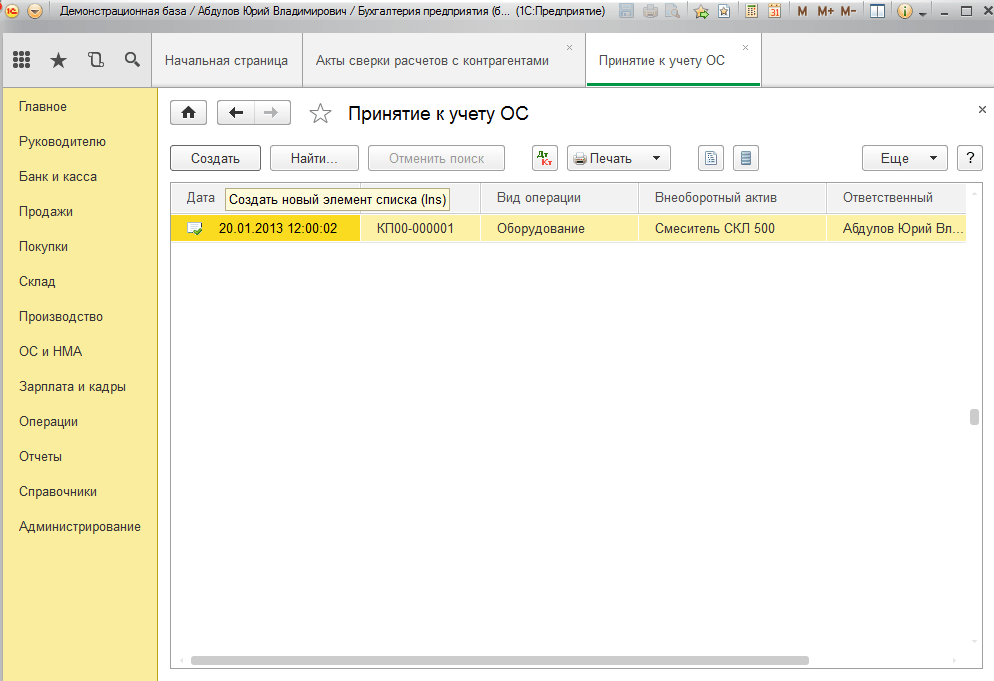 Ввод в эксплуатацию ОС в 1С осуществляется при помощи документа “Принятие учёта к ОС”. Чтобы его создать, перейдите в “ОС и НМА - Поступление ОС - Принятие к учёту ОС - Создать”.