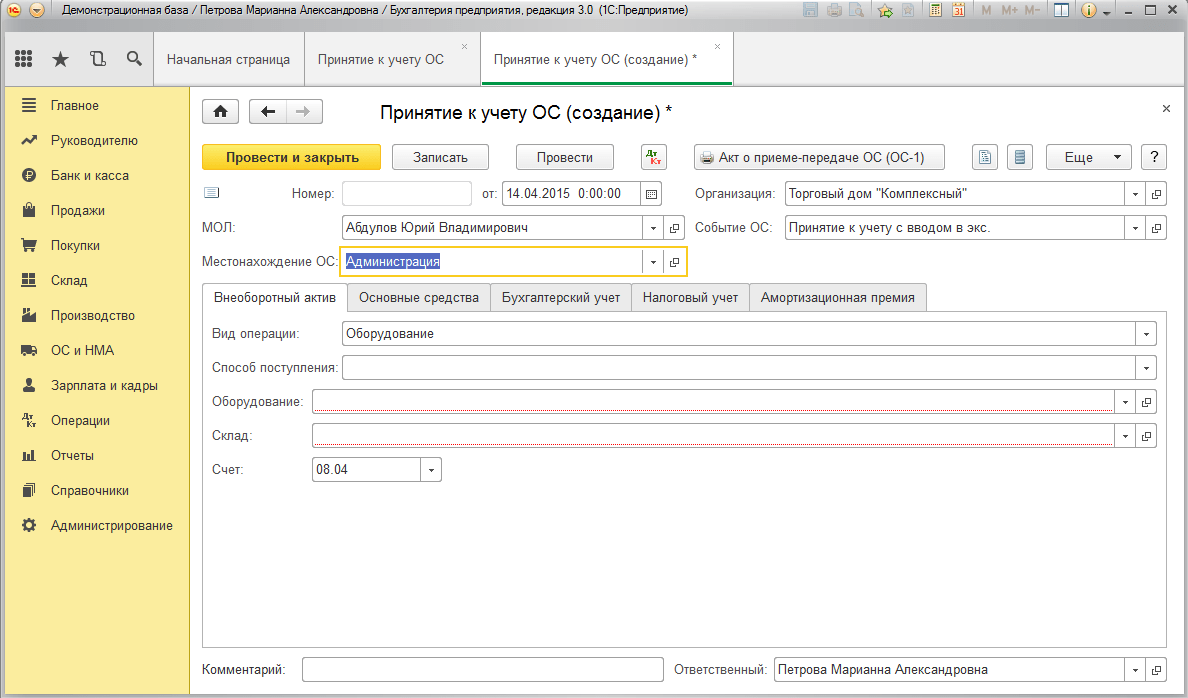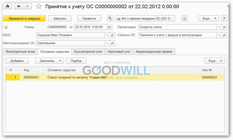 Для этого рассмотрим пошаговую инструкцию принятия основного средства к учёту на конкретном примере в 1С Бухгалтерия 8.
