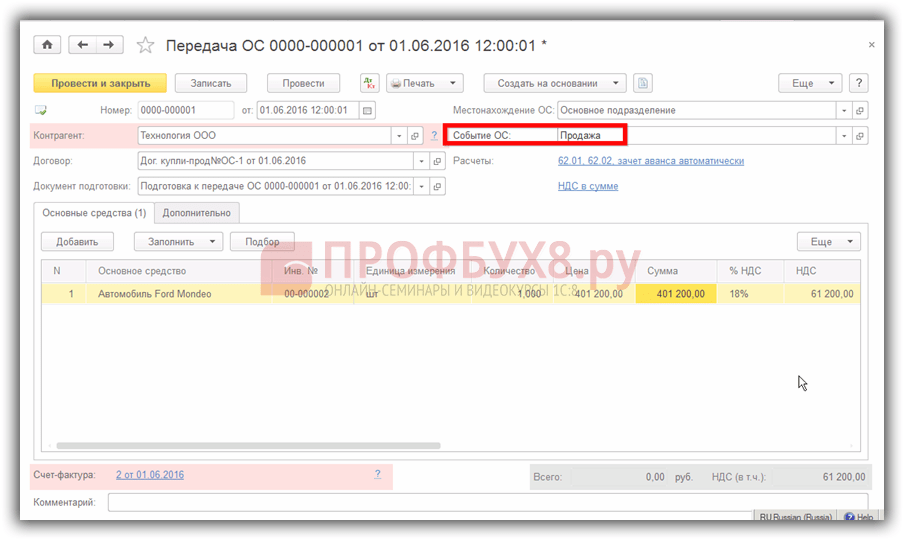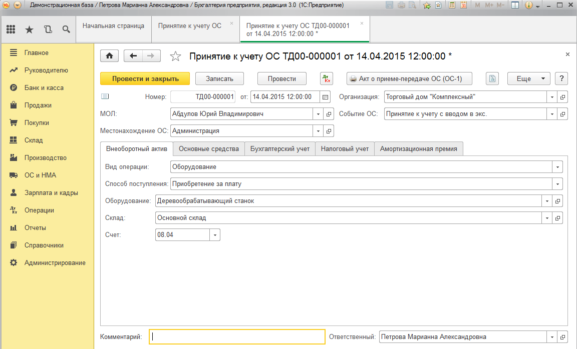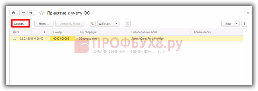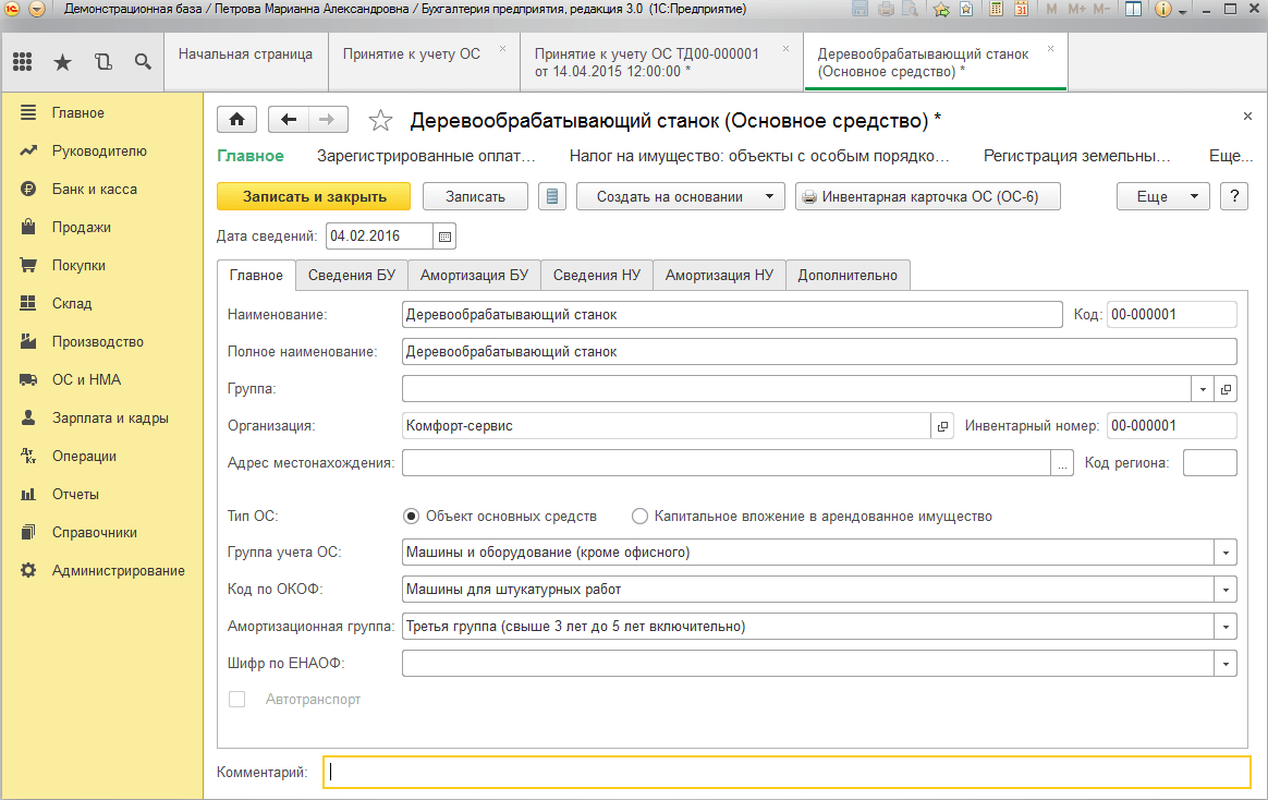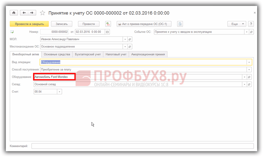 Проводить документ не будем, так как основное средство нам еще понадобится для рассмотрения операции амортизации.