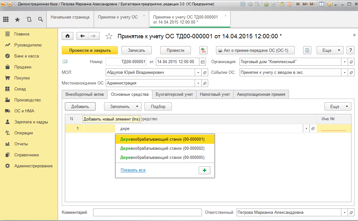 - Номенклатура – номенклатурные единицы из справочника «Номенклатура». В нашем примере это «Основное средство №1», созданное в справочнике вышеперечисленными методами.