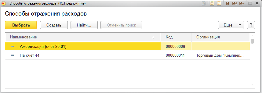 В строке “Способ отражения расходов по амортизации” по кнопке “Выбрать из списка” выбираем справочник “Способы отражения расходов”. Указываем из него нужный нам способ или создаём новый (по кнопке “Создать”). Формирование всех последующих проводок будет производится по выбранному вами способу.