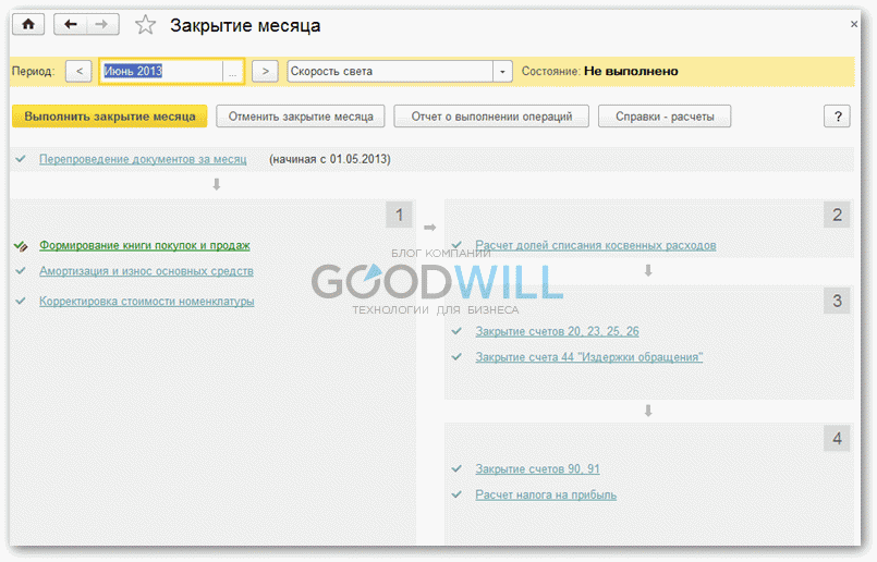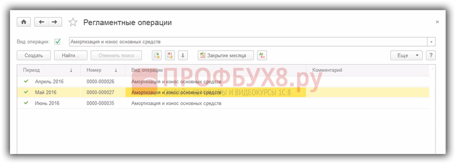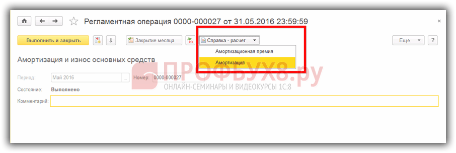 Чтобы открыть помощника, нужно зайти в меню «Операции», далее по ссылке « «. Сразу откроется окно помощника. В нем нужно выбрать период и организацию. Далее помощник сделает все сам. Все расчеты в помощнике делаются последовательно, и в первую очередь рассчитываются амортизационные отчисления. Если операция прошла без ошибок, будет создан документ регламентной операции «Амортизация и износ основных средств»: