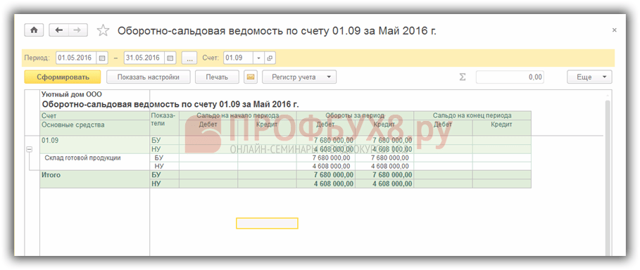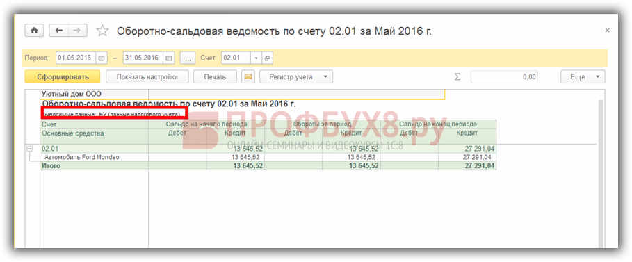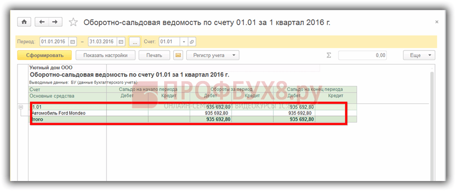 С помощью ОСВ проверим, как в отчете отражается наличие и стоимость основного средства: