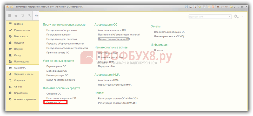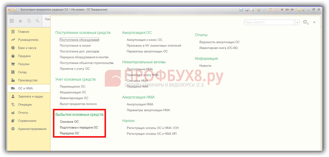 В системе 1С 8.3 для учета основных средств выделено несколько отдельных разделов, которые содержат в себе все необходимые операции для полноценной работы по данной теме: