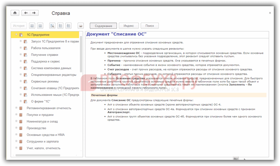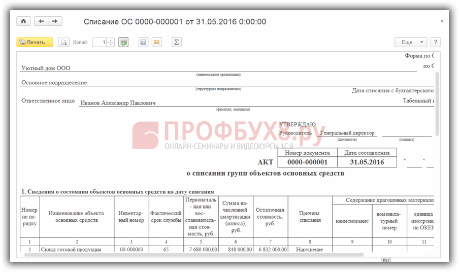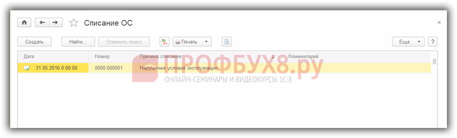 В результате списания основного средства соответствующий объект выбывает из организации, и амортизация на него больше не начисляется.Вышеперечисленные операции представляют собой базовые действия с объектами основных средств, которые выполняет программа «1С: Бухгалтерия». Другими хозяйственными операциями, которые могут потребоваться в процессе учета основных средств на предприятии, могут быть перемещение объектов основных средств, модернизация ОС и т. д., которые также автоматизированы в программе.