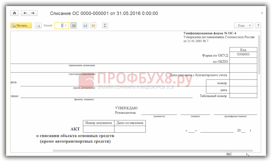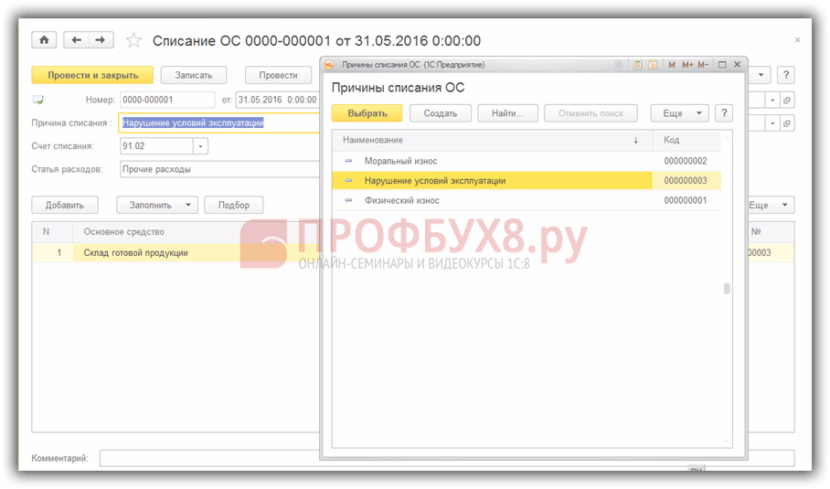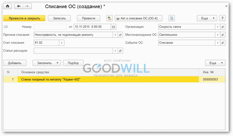 Здесь, помимо стандартных полей, указываем причину, по которой списывается основное средство: