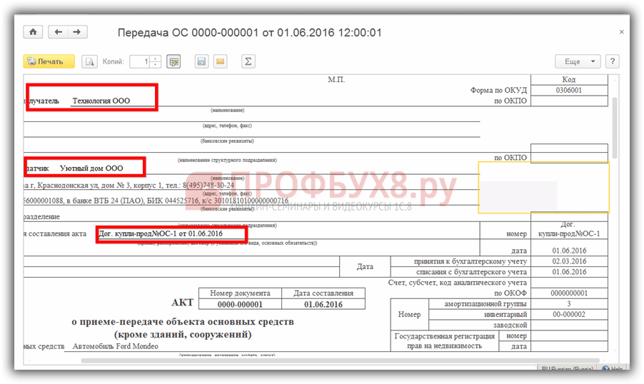 Смотрите Рис.1)(Рис.1) После проведения документа Принятие к учету ОС сформируются следующие бухгалтерские проводки(Смотрите Рис.2): Дебет 01.01 Кредит 08.04 — на стоимость объекта ОС.Для целей налогового учета по налогу на прибыль вводятся записи в специальные ресурсы регистра бухгалтерии: Сумма НУ Дт 01.01 и Сумма НУ Кт 08.04 – на стоимость актива;Сумма НУ Дт 20 (25, 26, 44) и Сумма НУ Кт 01.01 – на сумму расходов на приобретение актива. Если организация применяет Положение по бухгалтерскому учету «Учет расчетов по налогу на прибыль организаций» ПБУ 18/02, утв. приказом Минфина России от 19.11.2002 № 114н, то в учете будут отражены постоянные разницы между данными бухгалтерского и налогового учетов: Сумма ПР Дт 20 (25, 26, 44) и Сумма ПР Кт 01.01 – на сумму расходов на приобретение актива.