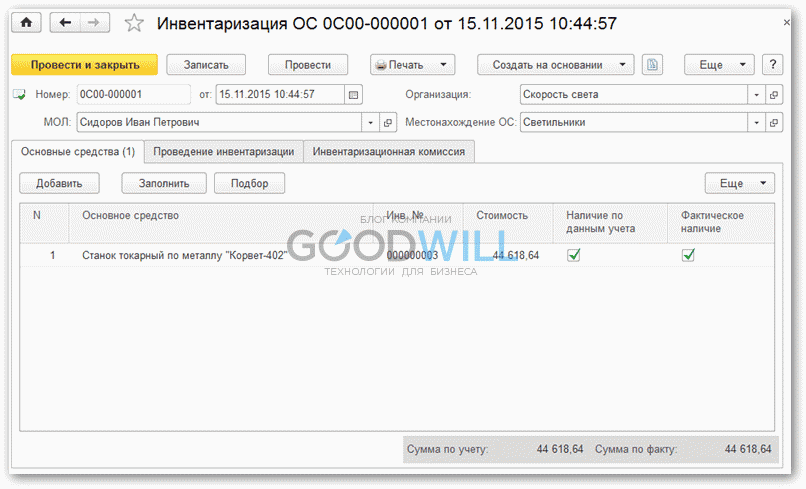 В случае, если в учете основное средство не числится, а фактически оно есть, на основании инвентаризации делается документ принятия к учету, и наоборот, если фактически отсутствует, делаем списание.