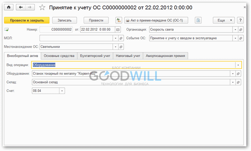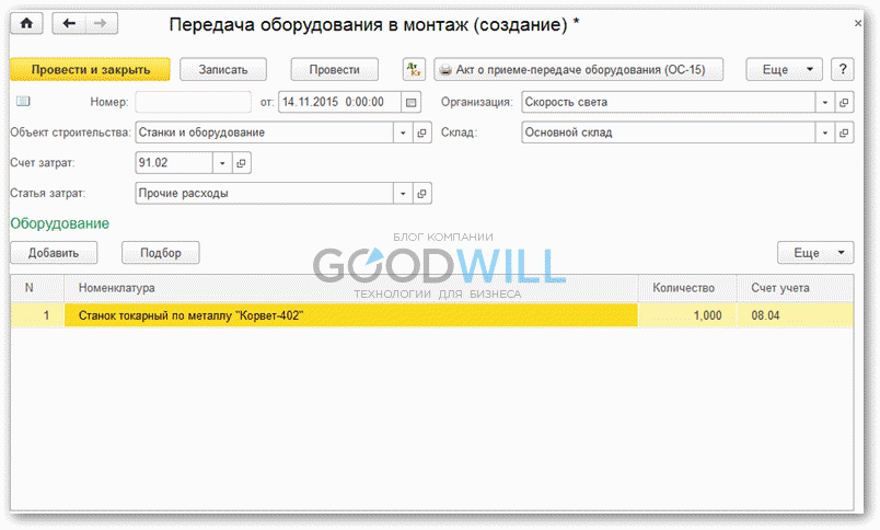 Данная процедура тоже уже мной описывалась ранее. Описывать не буду повторно, покажу лишь, как заполнен документ, и скажу, что в результате проведения документа оборудование переходит со счета 08.04 на счет 01.01.