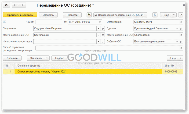 Перемещение основного средства очень похоже на перемещение товаров, только товар перемещается между складами, а основное средство — между подразделениями (ведь мы его уже приняли к учету).