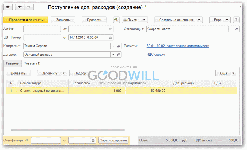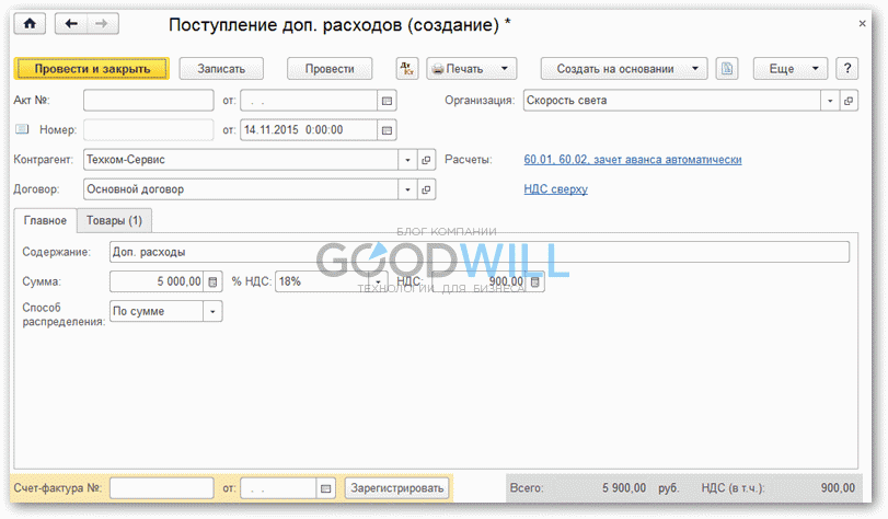 В табличной части, в закладке «Главное» указывается сумма дополнительных расходов: