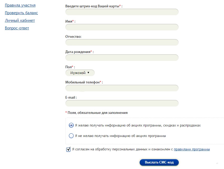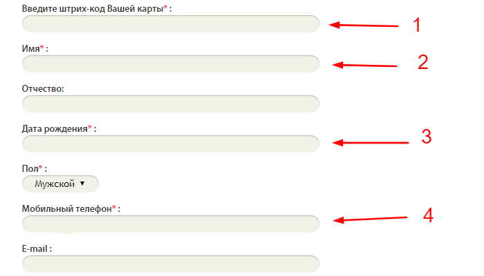- Заполните обязательные поля отмеченные красной звездочкой * .Для этого снова введите номер штрихкода, укажите имя, дату рождения, пол и мобильный телефон.