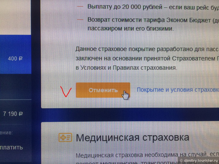 А вот дальше попадаем на страницу с ловушкой. Ваши полётные данные и цена вопроса будут указаны мелким шрифтом в левом верхнем углу. Всё остальное пространство будет занято предложением купить полётную страховку за 400 рублей.