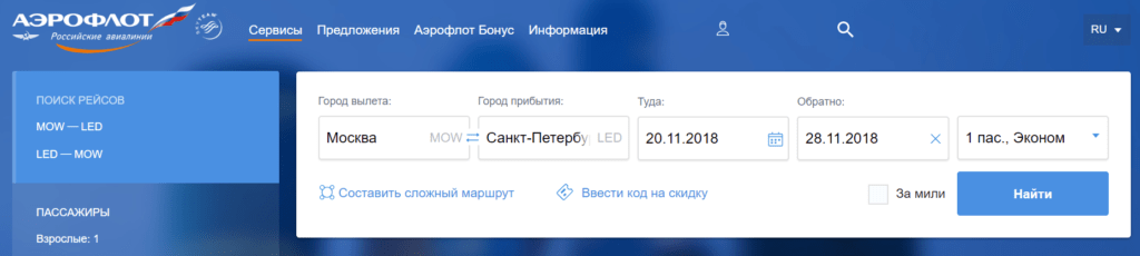 - Приобретение билета происходит на официальном портале «Аэрофлота». Для этого потребуется зайти на сайт, указать сроки перелета и направление.