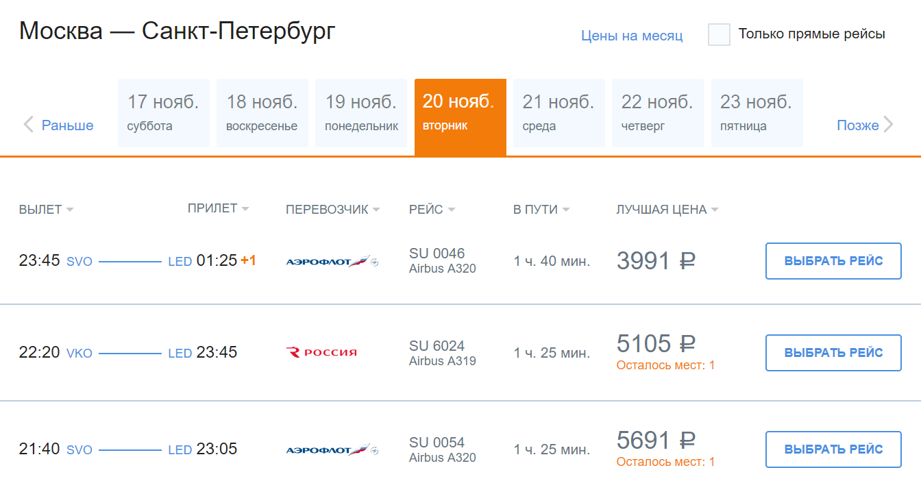 - Из всех предложенных вариантов выбрать тот, который максимально подходит вам по стоимости и времени в пути. Для покупки билета кликнуть «Выбрать рейс».