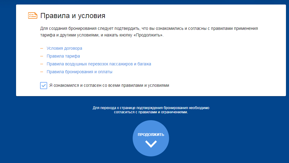 Не забывая при этом поставить галочку и согласиться с правилами и условиями авиакомпании.