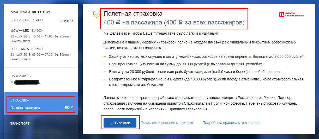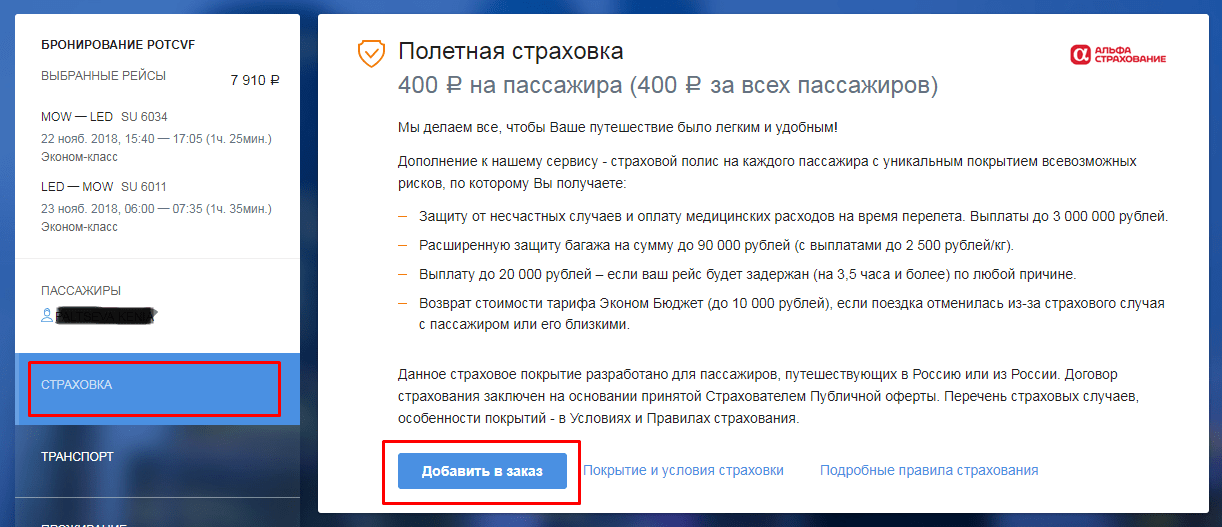 - На следующий шаг стоит обратить особое внимание. Именно на данном этапе компания не предлагает защиту, а автоматически включает страховку «Аэрофлота» в покупку билета. Стоимость полиса отображается в левой части экрана.
