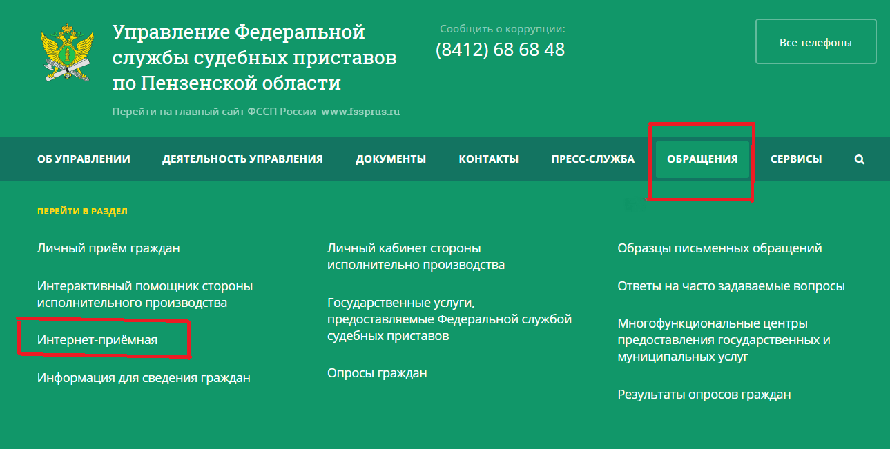 Чтобы направить обращение в электронном виде нужно зайти на официальный сайт территориального отделения службы, например, официальный сайт ФССП по Пензенской области, в раздел «Обращения граждан» и далее — «Интернет-приёмная».
