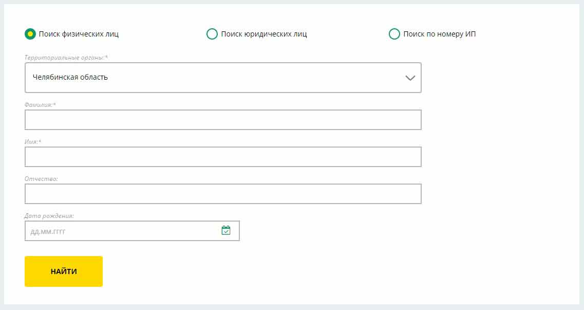Отмечаем «Поиск физических лиц», затем в поле «Территориальные органы:*» выбираем область регистрации физ.лица. Если физ.лицо проживает в свердловской области, выбираете «Свердловская область», если в Москве — «Московская область».