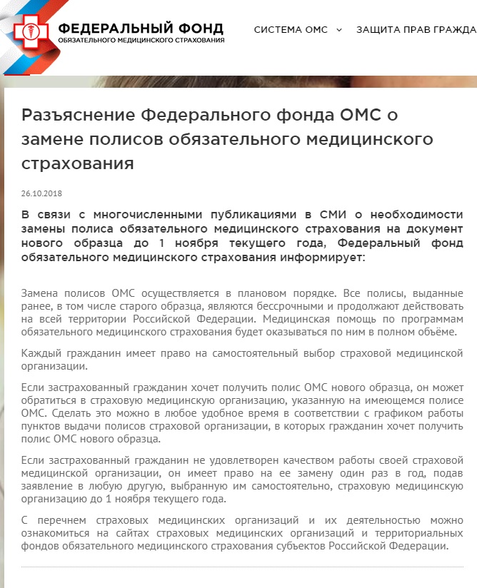 Недавно Московский фонд ОМС объявил, что приостанавливает выдачу полисов нового образца до января 2020 г. Из-за этого появился слух, что нужно всем до 1 ноября 2018 года срочно поменять полис ОМС старого образца на новый иначе будут проблемы с предоставлением медицинских услуг.