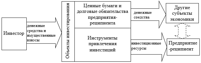 Из рисунка наглядно видно, что только при соответствии объектов инвестирования инструментам привлечения инвестиций свободные денежные средства, имущество или имущественные права инвестора трансформируются в инвестиционные ресурсы предприятия-реципиента.