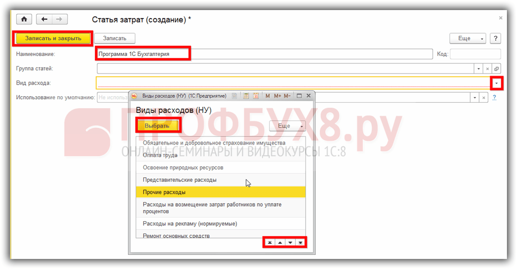 Устанавливаем вид расхода: