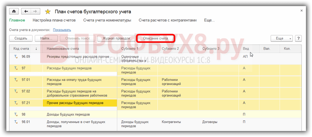 Все расходы будущих периодов учитываются на 97 счете в соответствии с инструкцией по применению плана счетов. Эту же информацию мы можем увидеть в программе 1С 8.3: