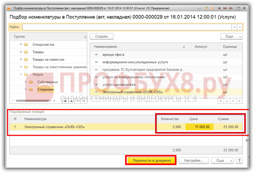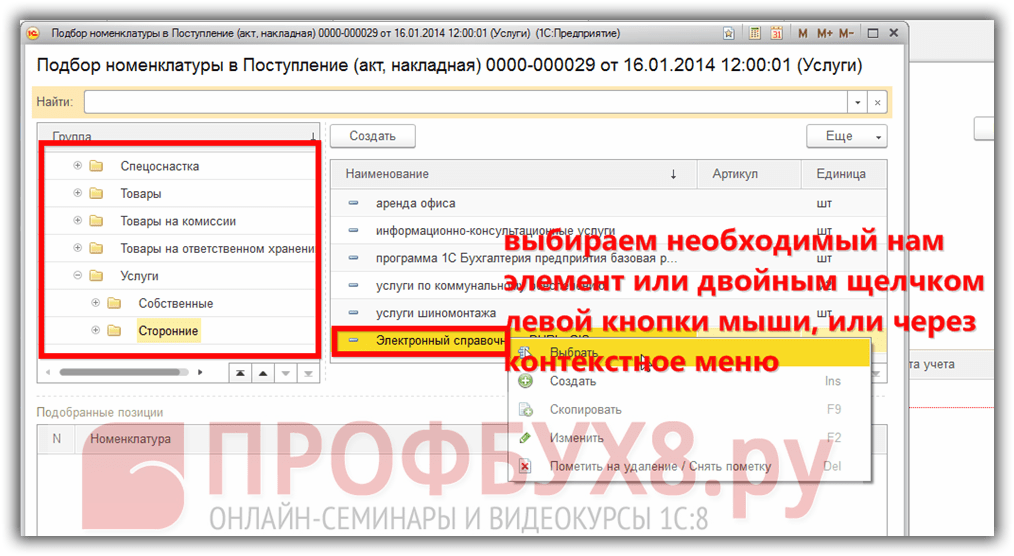 Если в номенклатуре уже создана карточка приобретаемого товара или услуги, то можно воспользоваться кнопкой Подбор, которая позволит выбрать нужный товар/услугу из необходимой группы: