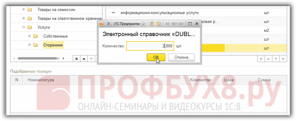 После этого в нижней части подбора номенклатуры видим выбранный элемент номенклатуры, указанное количество и стоимость единицы приобретаемой услуги: