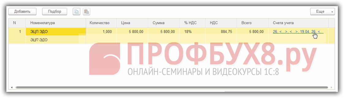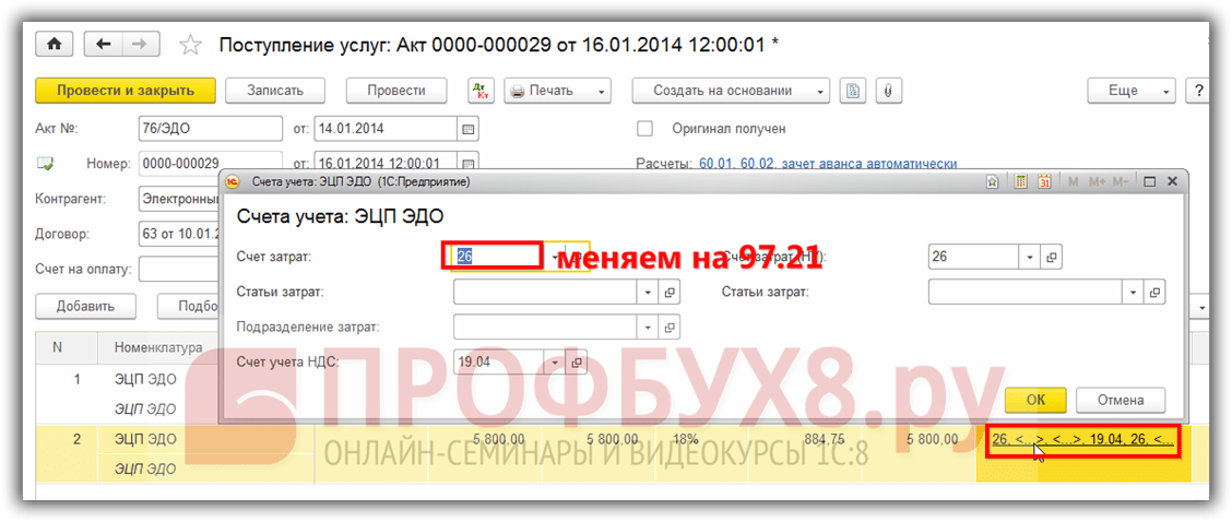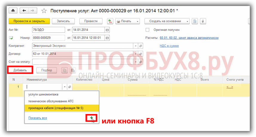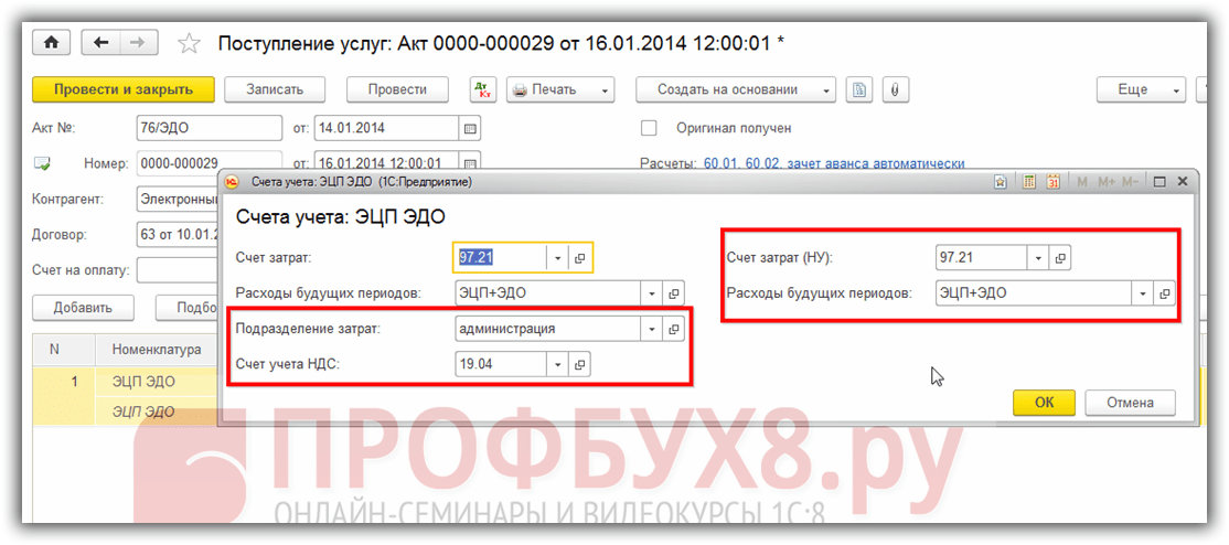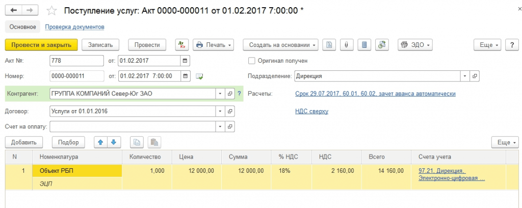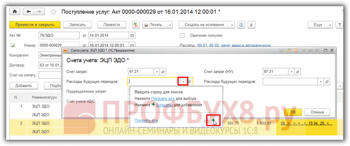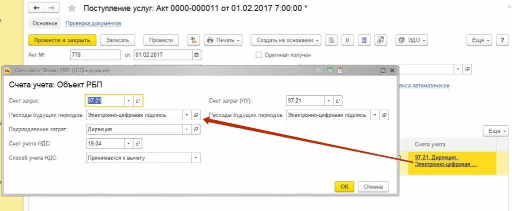 При первичном оприходовании информацию о РБП в 1С 8.3 можно заполнить непосредственно из приходного документа. Для примера приобретем электронную цифровую подпись и печать. Так как это , то оприходован он будет при помощи документа поступление услуг – Акт: