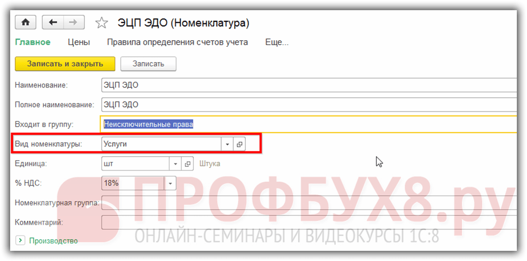 Также особое внимание стоит уделить такому параметру как Вид номенклатуры, так как именно он служит для настройки автоматизированных бухгалтерских проводок в 1С 8.3 и для правильного отражения приобретаемых/реализуемых товаров, работ или услуг в учете: