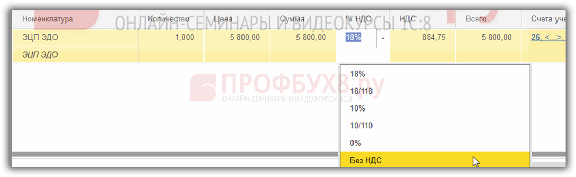 ШАГ 6 Оформление счета-фактуры на услуги В нашем примере передается право пользованием Программой “1С:Бухгалтерия 8.2 ред.2″ на основании лицензионного договора, что в соответствии с п.26 ст.149 НК РФ не облагается НДС. К тому же ООО «Бизнес Гид» применяет УСН, поэтому счет-фактуру не выписывает.