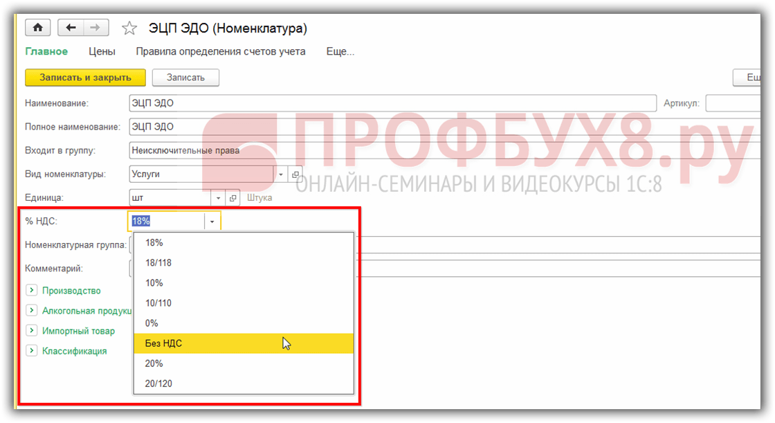 Так и в карточке номенклатуры – при условии, что данные ТРУ всегда освобождены от НДС: