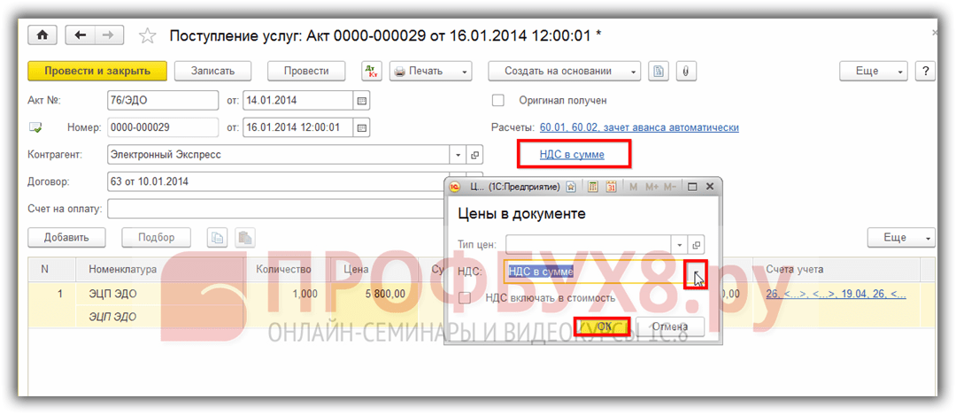 В документе Поступление услуг: Акт видим приобретаемые РБП, указываем его количество. И для того чтобы правильно отразить цену, следует обратить внимание на правый верхний угол документа: