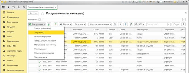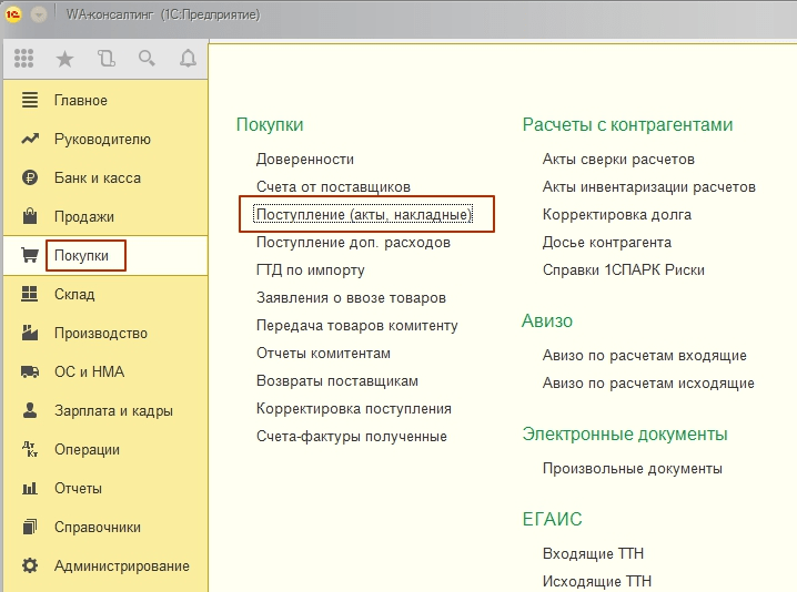 - Документ «Поступление (акты, накладные)»;
