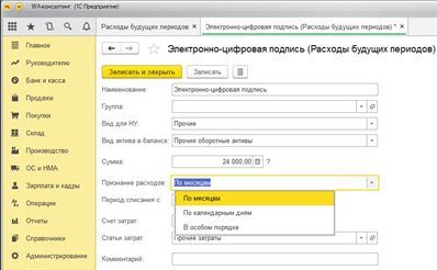 Для указания количества месяцев или расчета дней списания РБП карточка элемента содержит реквизит «Период». Именно в нем указывается, сколько времени будет происходить списание расходов будущих периодов в 1С на текущие расходы.