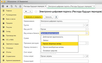 Выбираем вид актива в балансе. В нашем случае – Прочие оборотные активы: