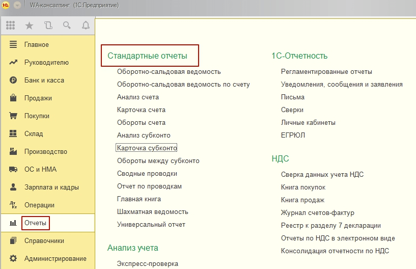- Отчет «Карточка субконто» и другие стандартные бухотчеты.