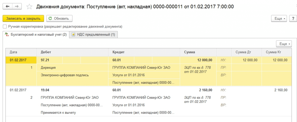 После проведения документа в 1С 8.3 можно увидеть бухгалтерские проводки: