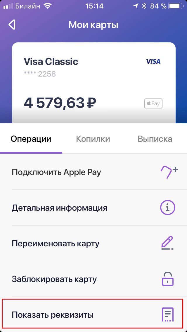 - После нажимаем Показать реквизиты и на экране телефона высвечиваются его реквизиты.