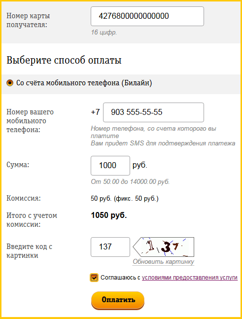 Комиссионные сборы за оплату денег с Билайна на карту Сбербанка