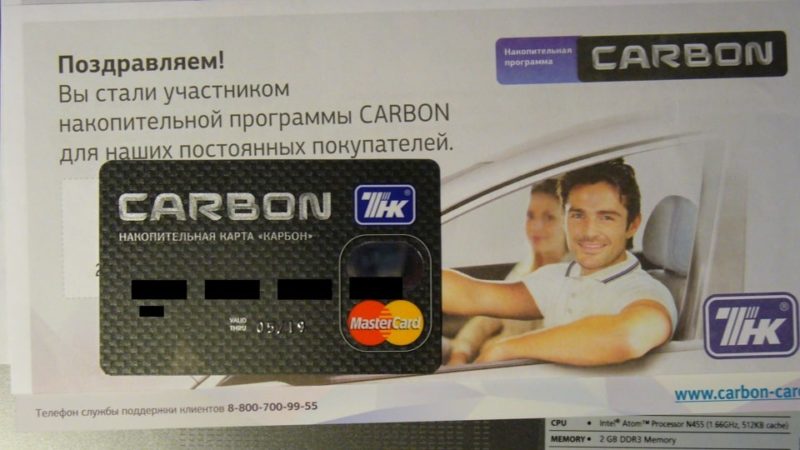 Накопительная программа Carbon от сети АЗС ТНК — средство поддержания лояльности клиентов. Программа дает возможность при оплате любых покупок дебетовой картой Carbon системы MasterCard получать бонусы (1,5% от суммы покупки) и тратить их в точках сети ТНК и партнеров (10 бонусов = 1 рубль).