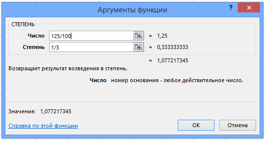 В ячейке формула будет выглядеть следующим образом =СТЕПЕНЬ(125/100;1/3)-1