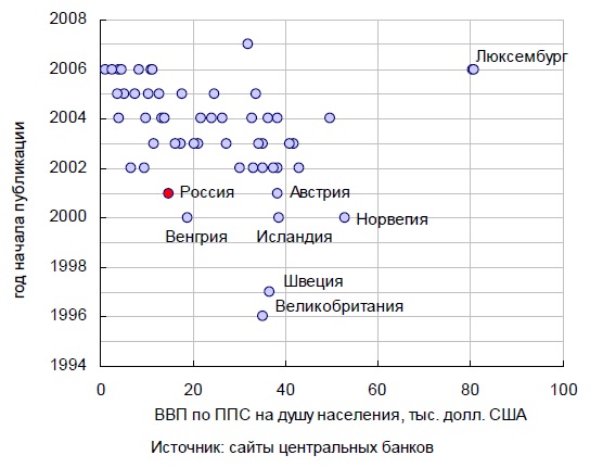 Необходимо отметить, что Банк России также начал публиковать обзор финансовой стабильности одним из первых центральных банков в мире – в 2001 г. Однако в электронном виде на сайте Банка России обзор распространяется только с 2003 г. 2 В целом публикация обзоров финансовой стабильности в значительно степени зависит от уровня экономического развития страны. Страны, в которых органы денежно-кредитного регулирования выпускают регулярные обзоры финансовой стабильности, средний уровень ВВП на душу населения составляет 25 тыс. долл. США (по паритету покупательной способности), а в странах, где таких обзоров не существует, уровень ВВП на душу населения в среднем в 3 раза ниже и составляет около 8 тыс. долл.