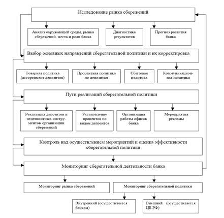 Взаимосвязь сберегательной и депозитной политики коммерческого банка следующая: с одной стороны, основные направления депозитной политики являются элементами формирования сберегательной деятельности банка (например, ассортимент депозитов, процентная политика, продвижение продукта на рынке, организация работы соответствующих подразделении коммерческого банка). С другой стороны, назвать депозитную политику составным элементом сберегательной политики банка нельзя. Депозитная политика банка - это более широкое понятие, включающее кроме стратегии и тактики привлечения ресурсов на возвратной основе, также организацию и управление депозитным процессом.