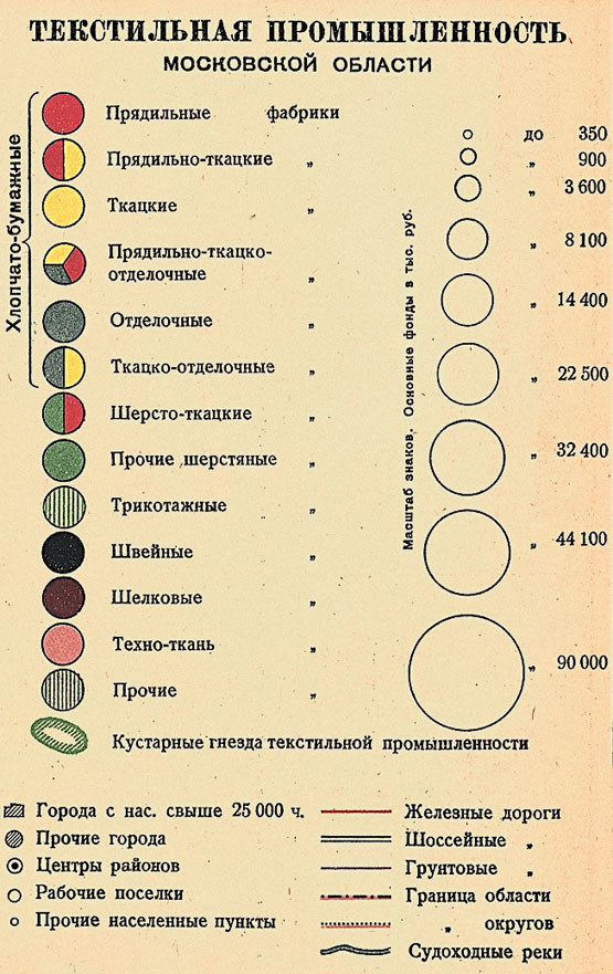 На карте текстильной промышленности показана только центральная часть области, в которой сосредоточена главная масса текстильных фабрик. Но и в центральной части области текстильная промышленность размещена неравномерно, концентрируясь в Москве и к востоку от Москвы, где она образует большой текстильный район. Кроме этого основного текстильного района, выделяются еще несколько отдельно лежащих текстильных узлов: Серпуховской, Калининский, Вышне-Волоцкий, Нарофоминский, Озерский.