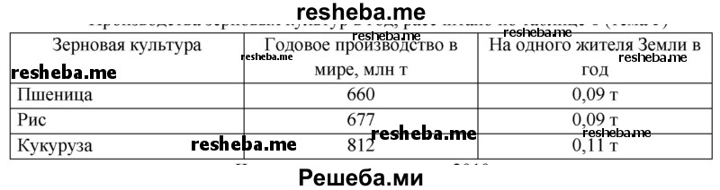 Главный пшеничный пояс протягивается в Северном полушарии, меньший по размерам - в Южном. Пшеницу выращивают почти в 70 странах, однако преобладающая часть её валового сбора приходится всего на несколько стран. В США, Канаде, Австралии, Аргентине, Китае, Индии, Франции, России, на Украине сформировались главные мировые житницы - специализированные районы пшеничного хозяйства. Почти 9/10 мирового сбора риса приходится на страны Азии (Индия, Бангладеш, Китай, Япония и пр.). Также важной зерновой культурой является кукуруза. Посевы этой культуры большей частью территориально совпадают с посевами пшеницы. Однако основным её производителем были и остаются США, за которыми следуют Китай и Бразилия.