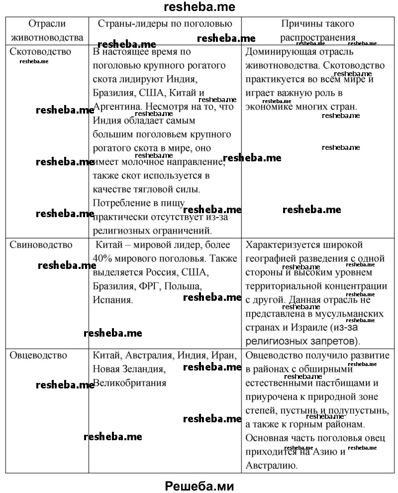 10. Назвать страны, занимающие первое место в мире по поголовью крупного рогатого скота, свиней и овец?