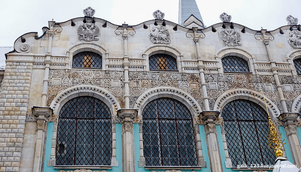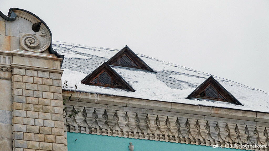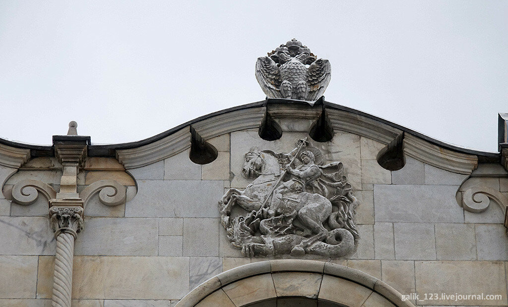 5. Верх здания украшен резным орнаментом, рельефами гербов России и Георгия Победоносца.