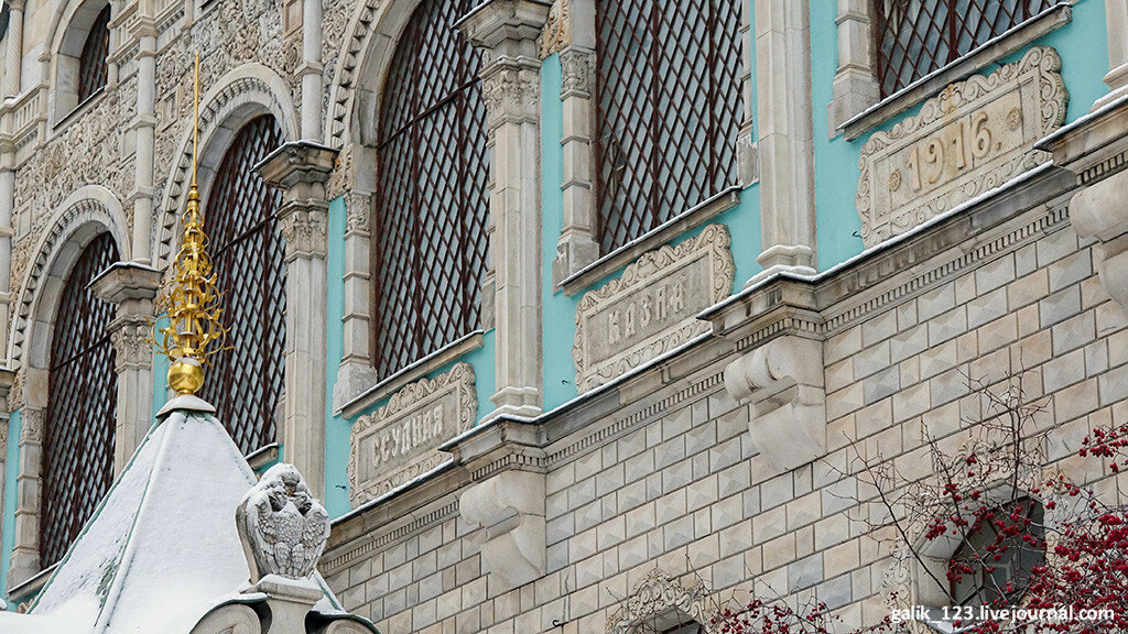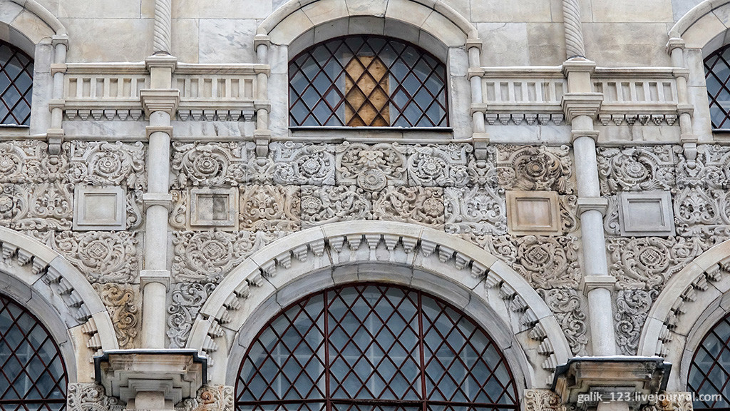 Если свернуть с Тверской в Настасьинский переулок, что напротив Английского клуба, то совсем скоро можно увидеть нарядное здание со множеством декоративных деталей на фасаде. Не включить его в мою коллекцию просто невозможно. Тем более, что удалось снять его целиком, хотя переулок довольно узкий. Дом этот выглядит совершенно сказочно, ничего похожего в самом центре Москвы нет. Формально в оформлении здания используются мотивы русского зодчества, так называемый неорусский стиль, но присутствуют и элементы других стилей. Левое и правое крылья здания напоминают терема с лазурными стенами. Углы здания облицованы рельефной кладкой, под названием бриллиантовый руст. Прекрасный образец эклектичного стиля...